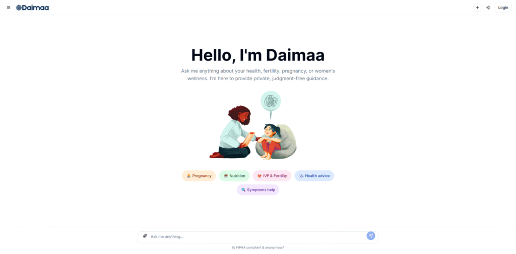 That’s exactly what Daimaa is. It’s not just a tracker — it’s a private, judgment-free AI assistant built exclusively for women. From period queries and fertility planning to mood swings, PCOS, and PMS self-care — Daimaa is here to help you anytime, anywhere.