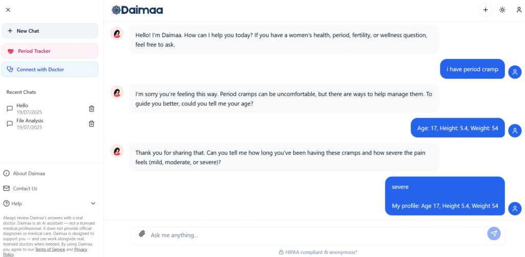 On the other hand, Daimaa is conversational, empathetic, and built with real Indian women’s experiences in mind. Whether your period is late, irregular, painful, or you just need to vent about cramps — Daimaa listens, learns, and supports without judgment.